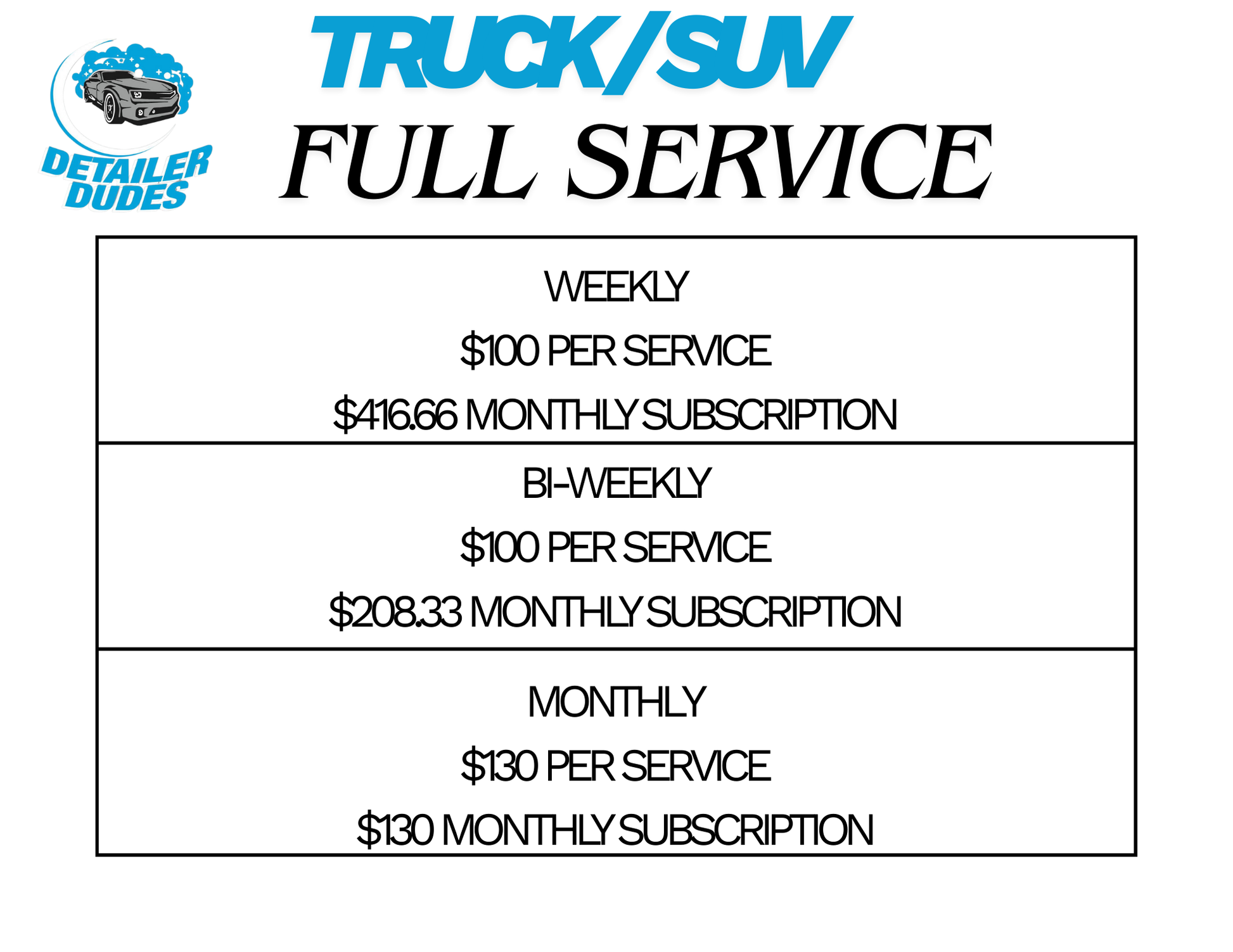 Choose weekly, biweekly, or monthly service based on how often you want your vehicle maintained.Weekly, Bi-Weekly, Monthly, Bi-Monthly, or Quarterly